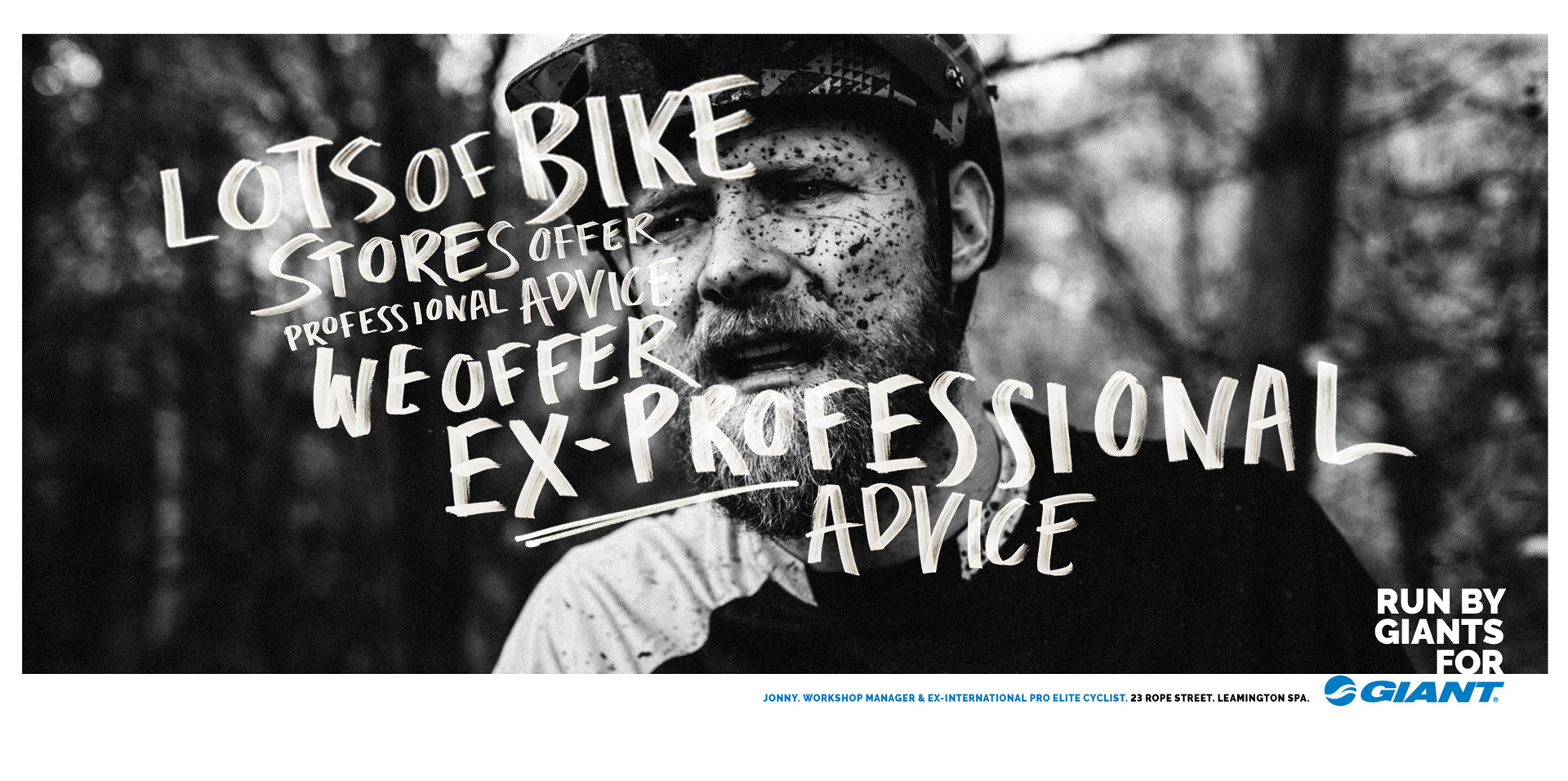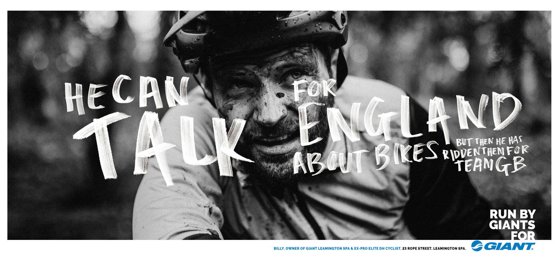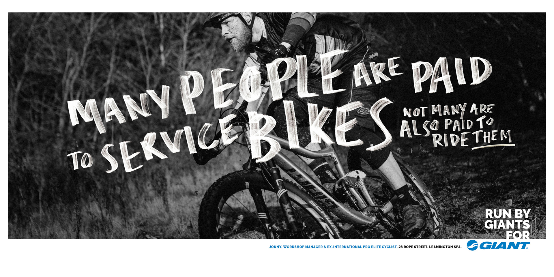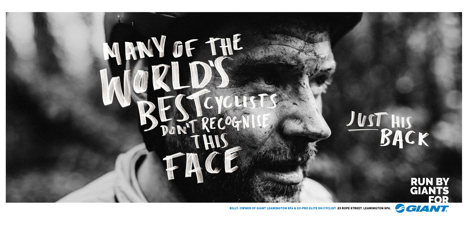 Evans Cycles, a large multi-national bike retailer arrived in Leamington Spa last year, announcing their arrival with a localised 48-sheet campaign. The messaging was the usual clichés like specialist advice, here to help etc...However, just up the road is Giant Bikes - a smaller specialist dealer whose staff, including franchisee and legendary mountain biker Billy Cheetham, are all ex or current professional cyclists. This 48-sheet campaign firmly placed Giant as the go to store for real biking knowledge.