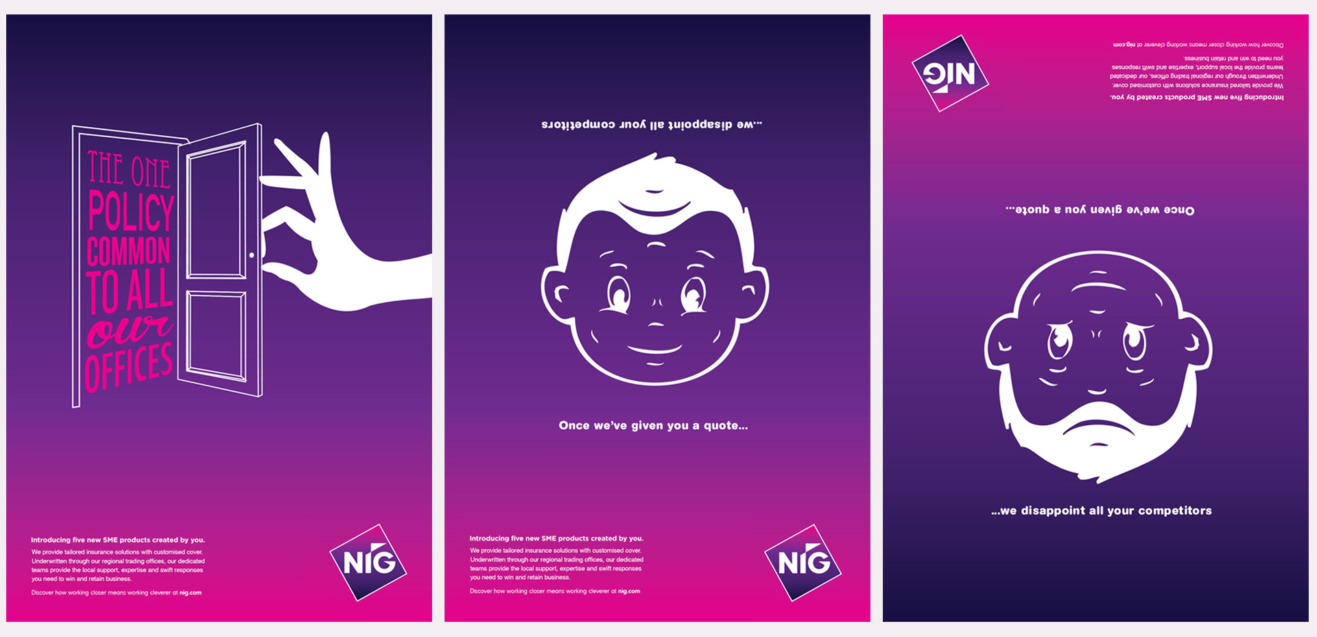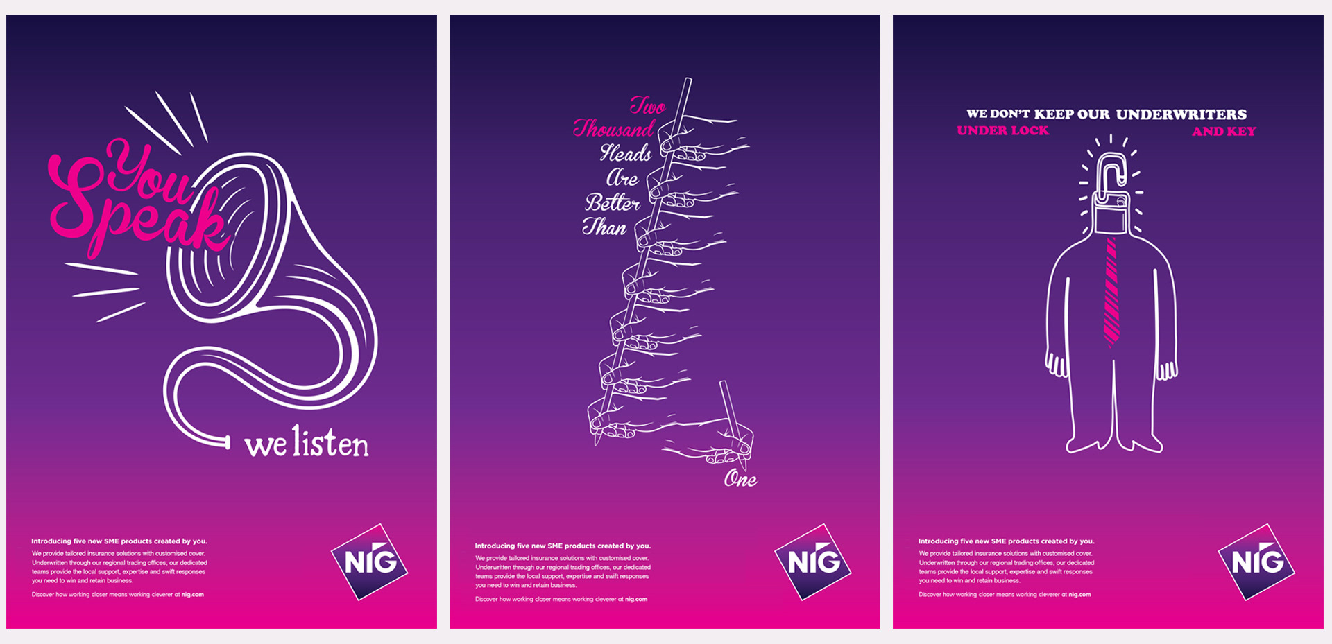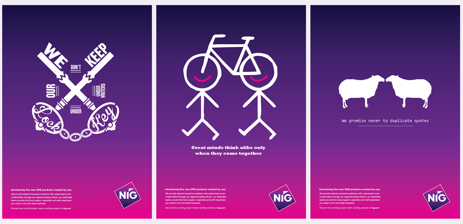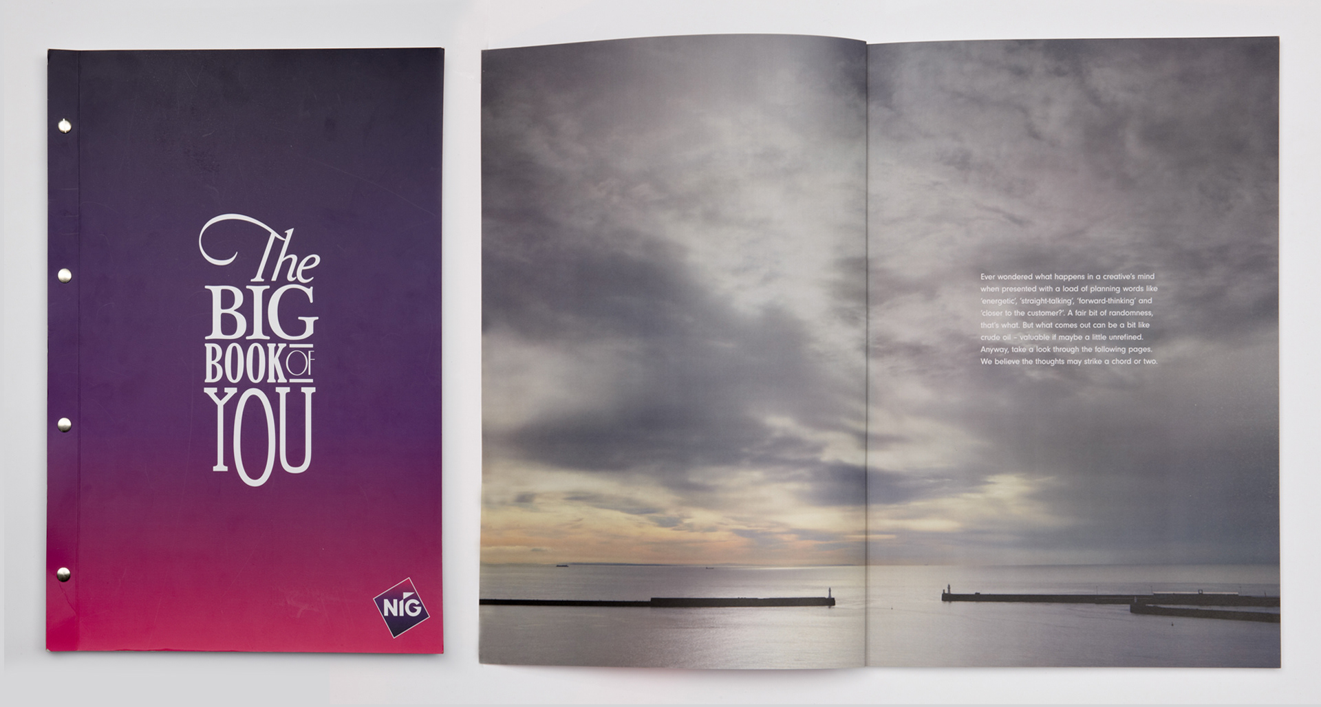 Concept and design for a positioning brand book for NIG, who specialise in commercial insurance. This down-to-earth tone gave NIG a clear, friendly and open brand voice that well and truly elevated them within the grey commercial insurance sector.