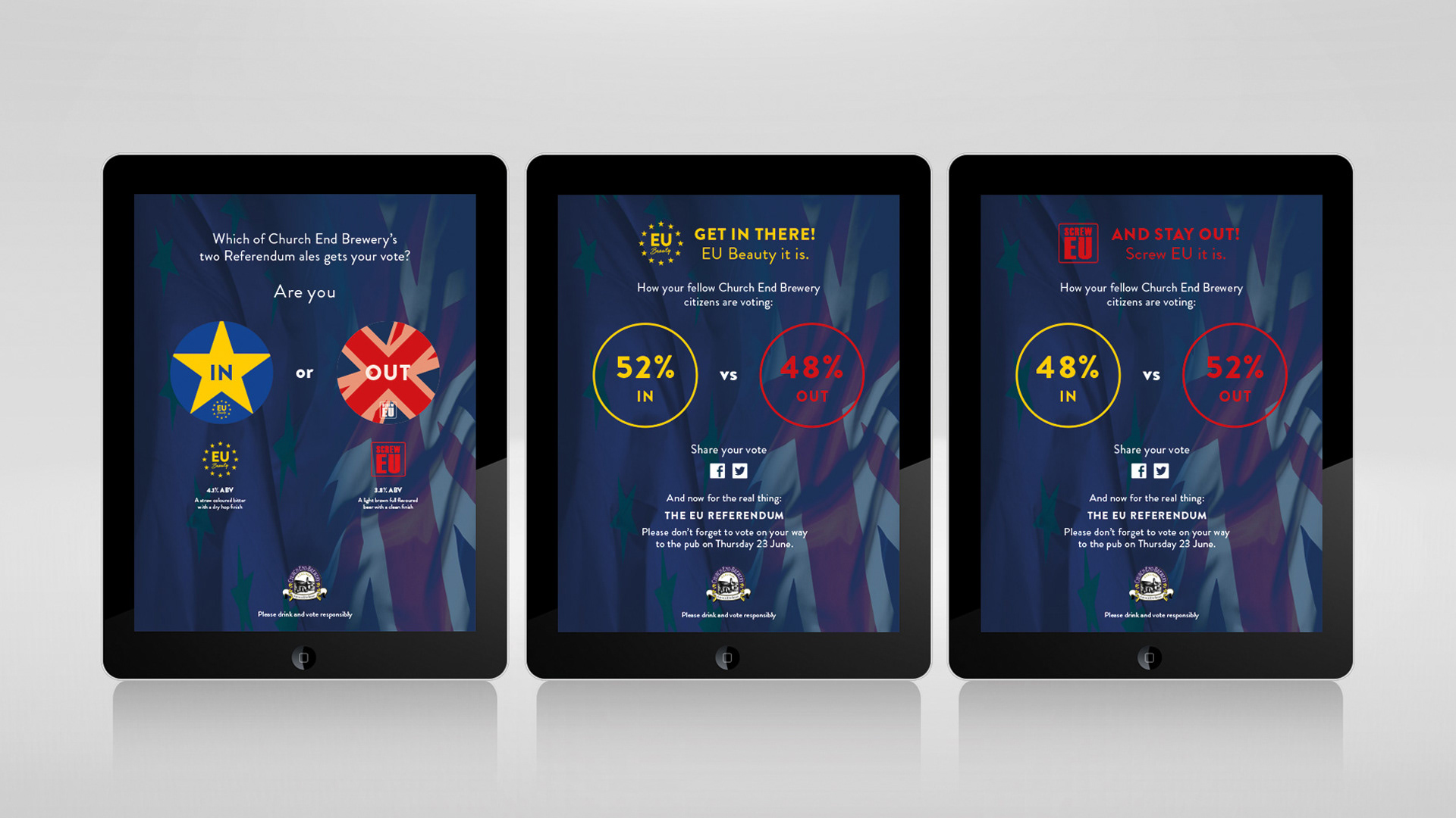 EU Beauty and Screw EU were names given to two ales to mark the EU Referendum. A fully integrated campaign including posters, beermats, an online film from the brewery spoofing an election campaign and a microsite aimed at capturing votes.
