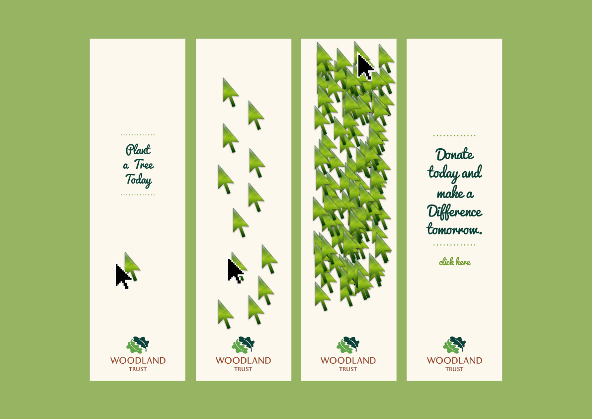 A very user friendly banner that serves to encourage hits on the Woodland Trust site and ultimately lead to donations and awareness. Wherever the user moved the cursor, smaller green tree shaped cursors would appear.